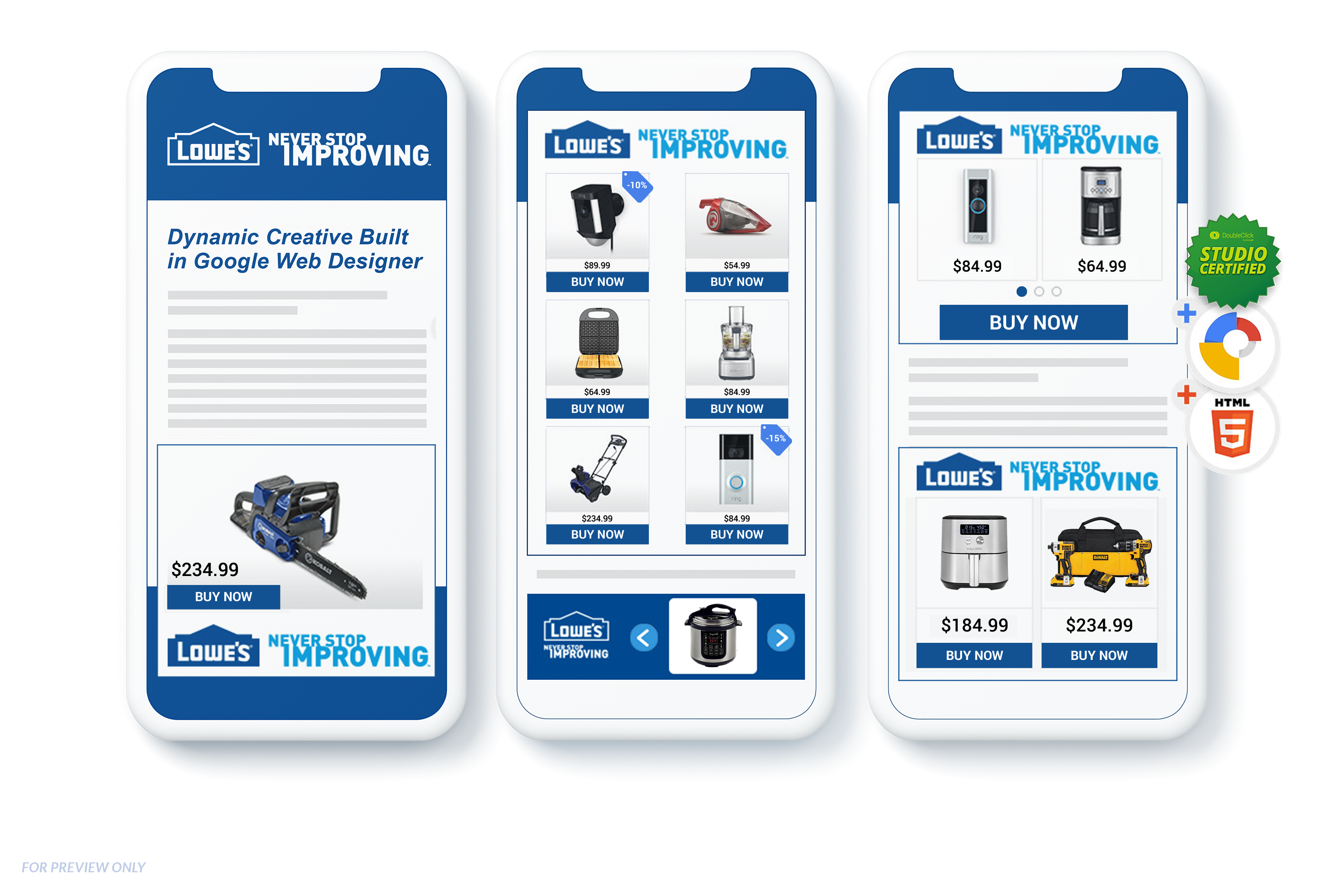 With Google's Dynamic Display Ads, I was able to automate personalized banner ads in a fraction of the time, increasing production drastically. Google Web Designer Certified and Google DoubleClick HTML5 Core Certified.